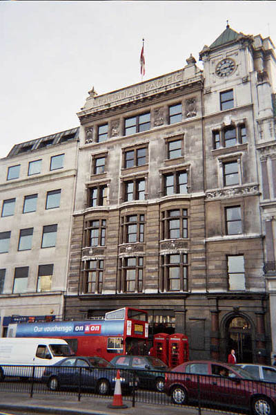 Canadian Pacific House, on the facing Trafalgar Square from the south (where the photo was taken of Nelson's Column). Nearly a century old, the Canadian flag still flies over the building, with its name carved in stone at the top of the building. Now, after the breakup of the