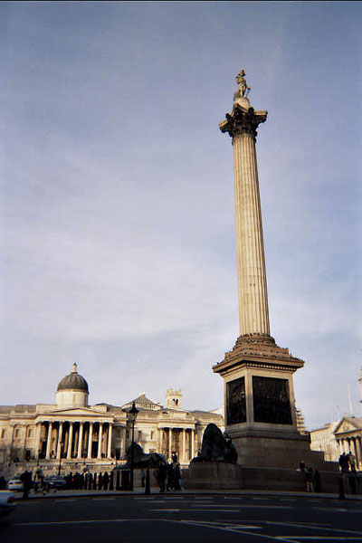 Square. The central monument is 170-ft Nelson's Column, dedicated a few decades after his 1805 victory off Trafalgar, which ushered in a century of British dominance of the seas and of prosperous trade. The bronze plaques are made from melted French cannon. Across is the National Gallery, on the north side, and on the right edge is St. Martin in the Fields church. When it was first built, the monks really did have to come out from "London" to the West Minister area to farm, and built their first church out in their fields. Westminster has been the London home of British royalty since the early 1000s. The Canadian Embassy is off to the left (west) side of the square.